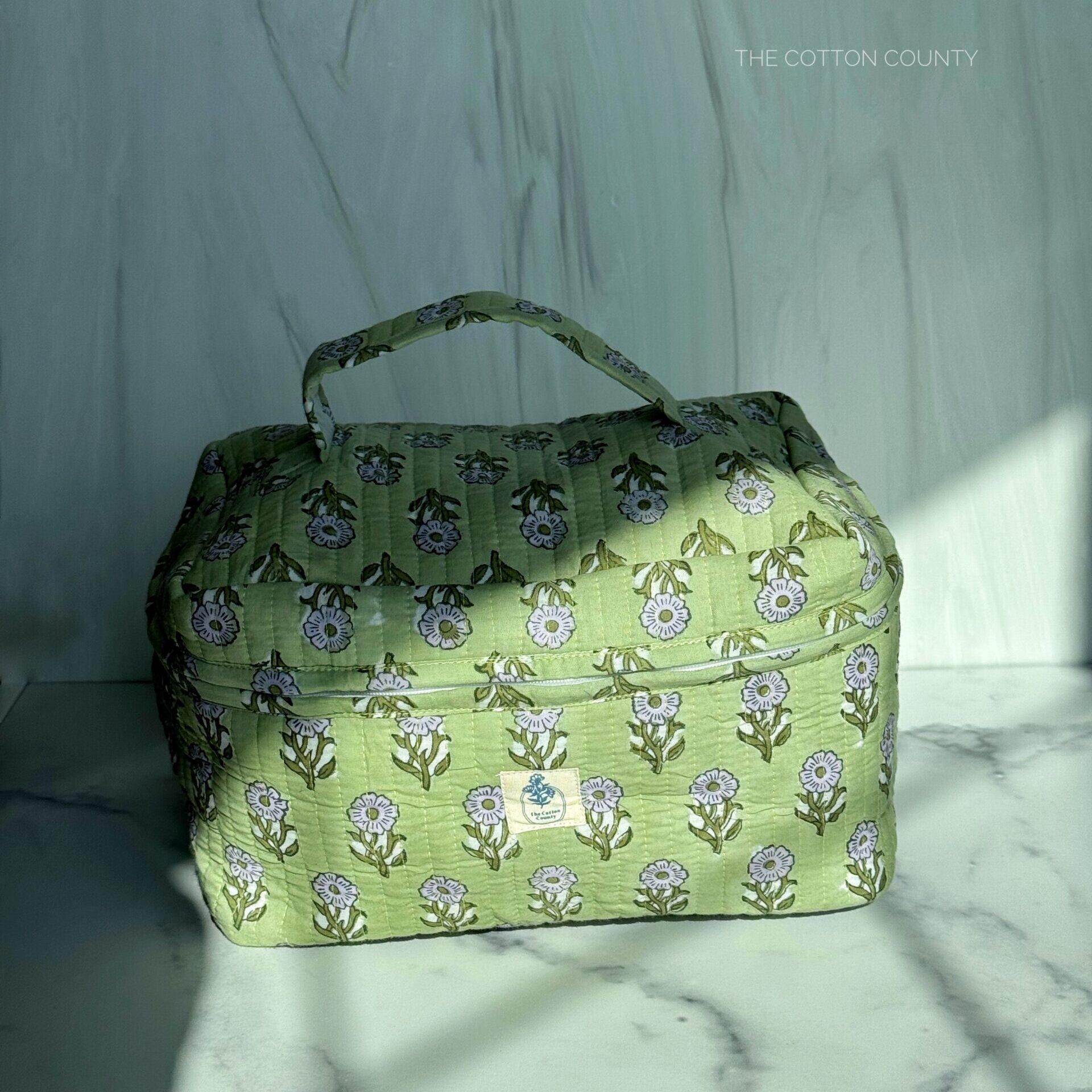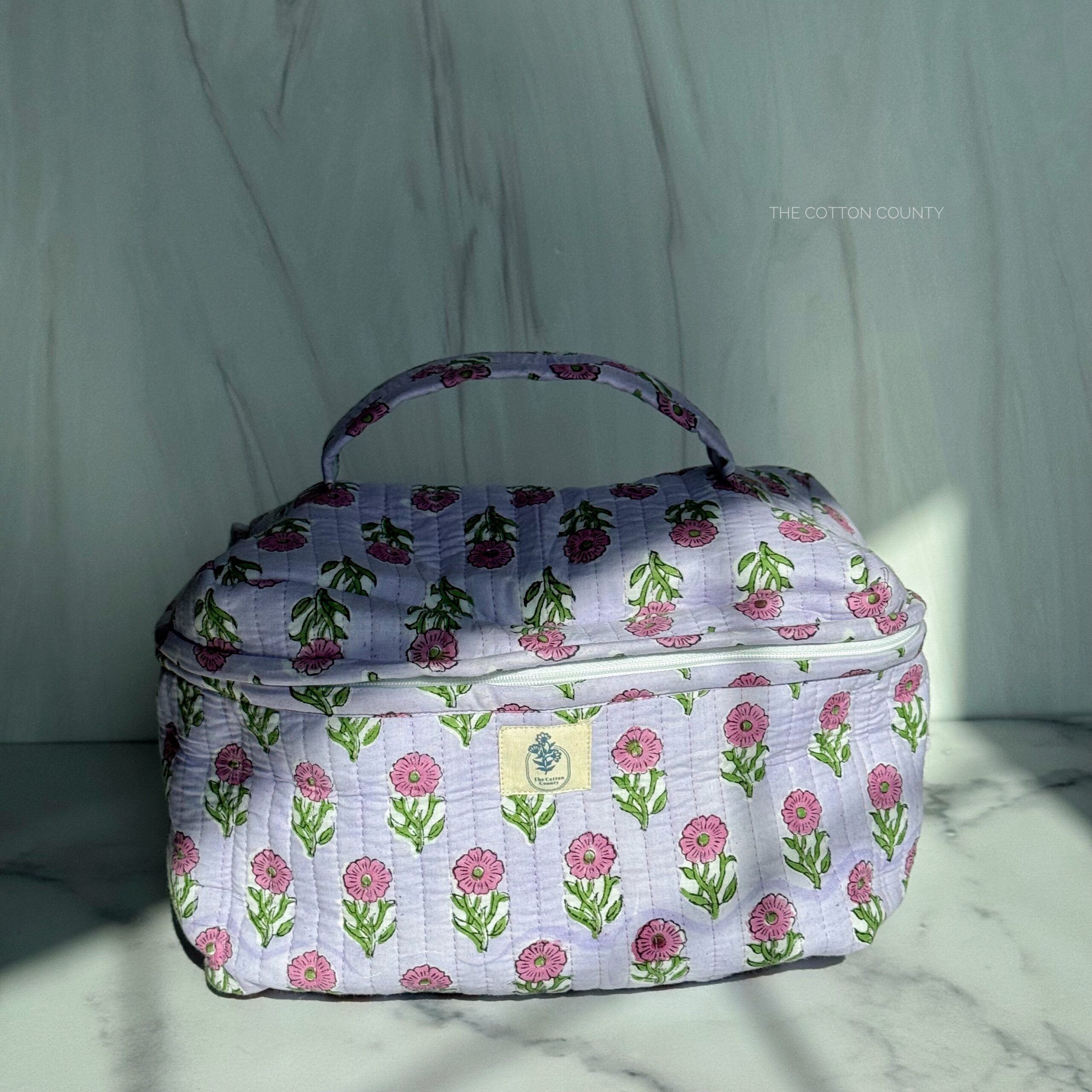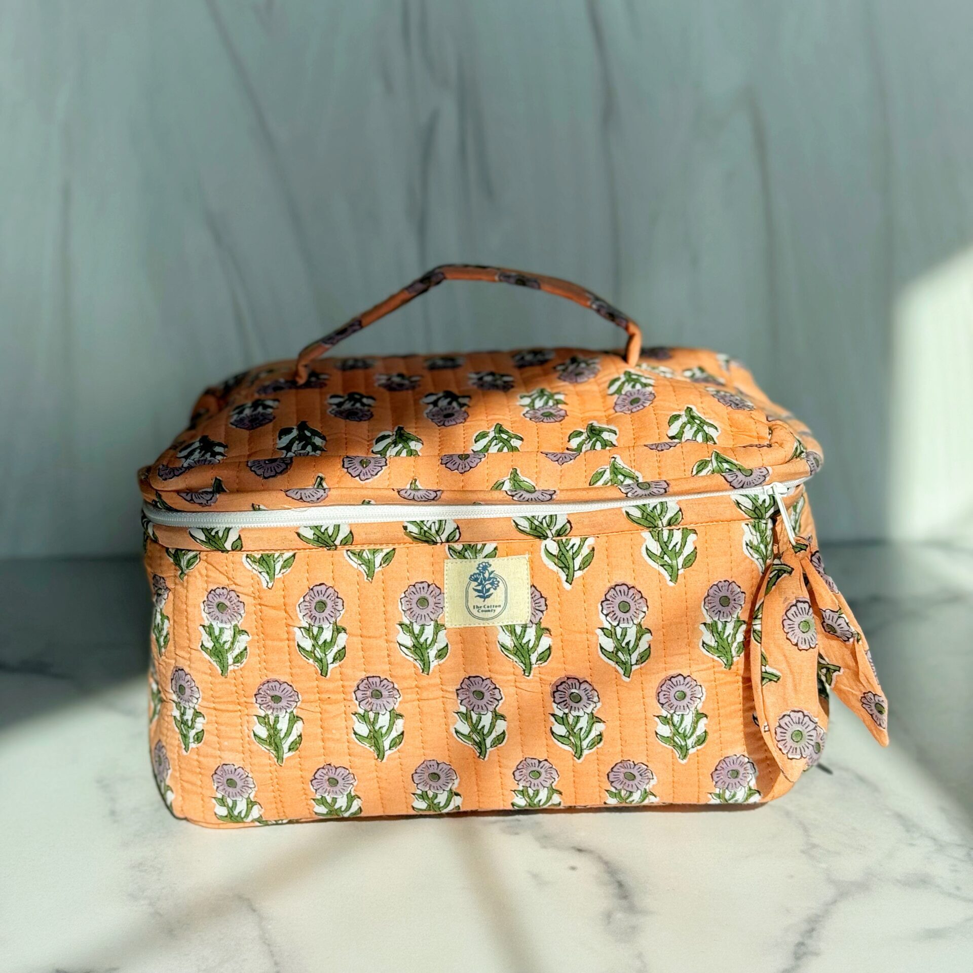 Organize your beauty essentials in style with this hand block printed cotton vanity bag. Features a spacious compartment, wipeable lining, zipper closure, and carry handle — perfect for makeup, toiletries, or travel.