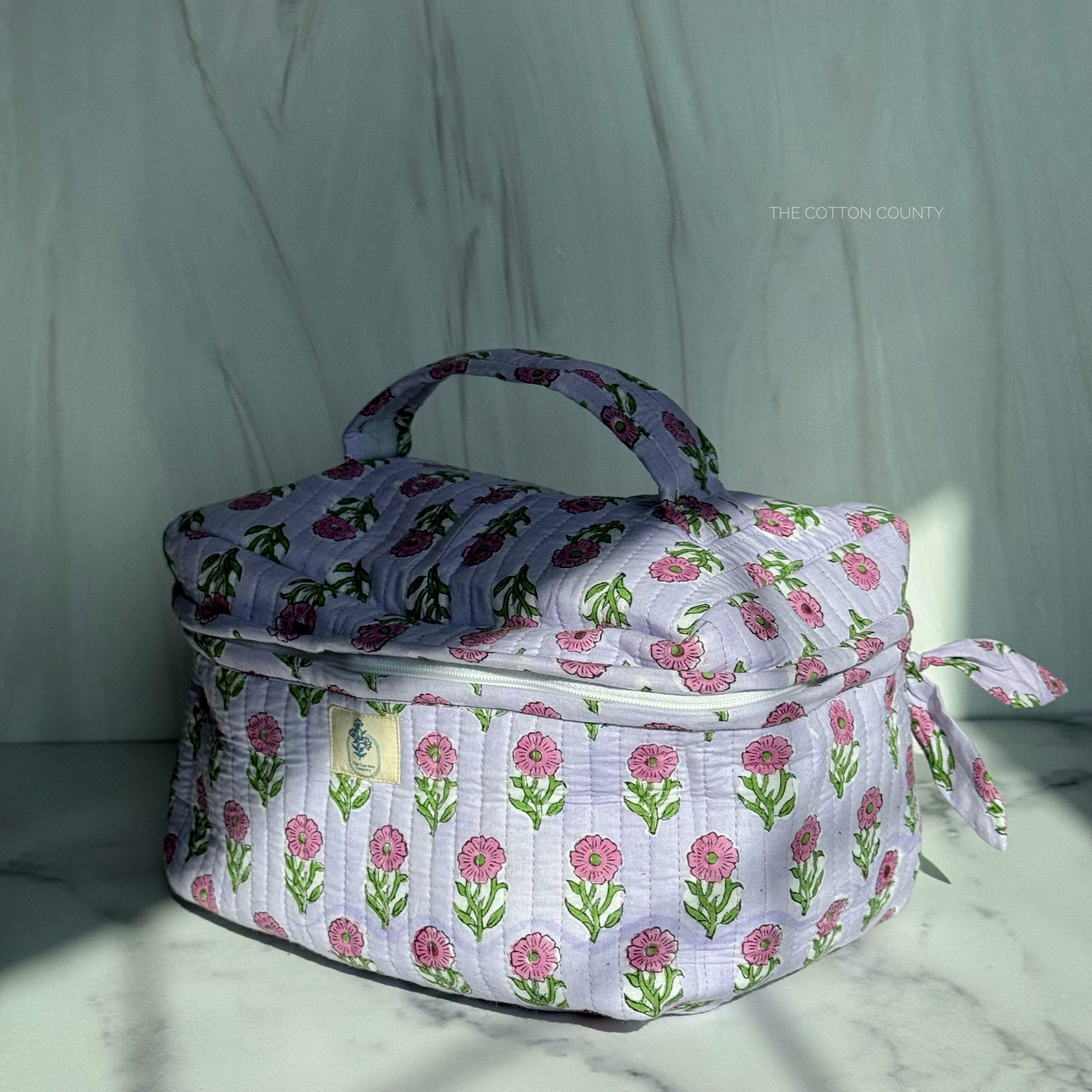Stay effortlessly organized with this spacious and stylish floral makeup/ vanity bag. Crafted from 100% cotton and adorned with traditional floral hand block prints, this large-capacity vanity bag is perfect for storing makeup brushes, skincare products, perfumes, toiletries, and more.