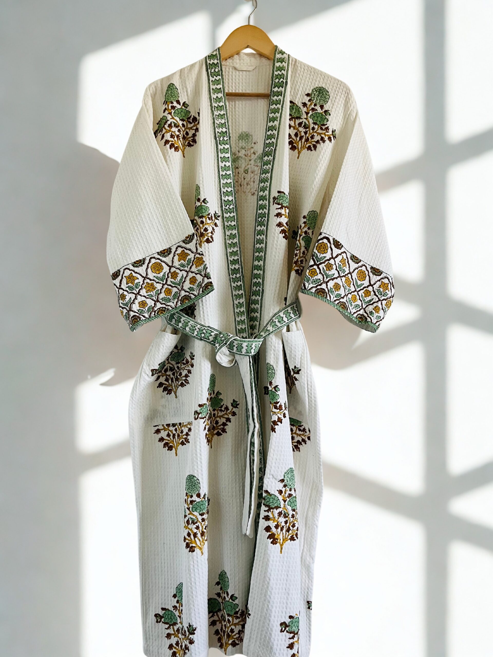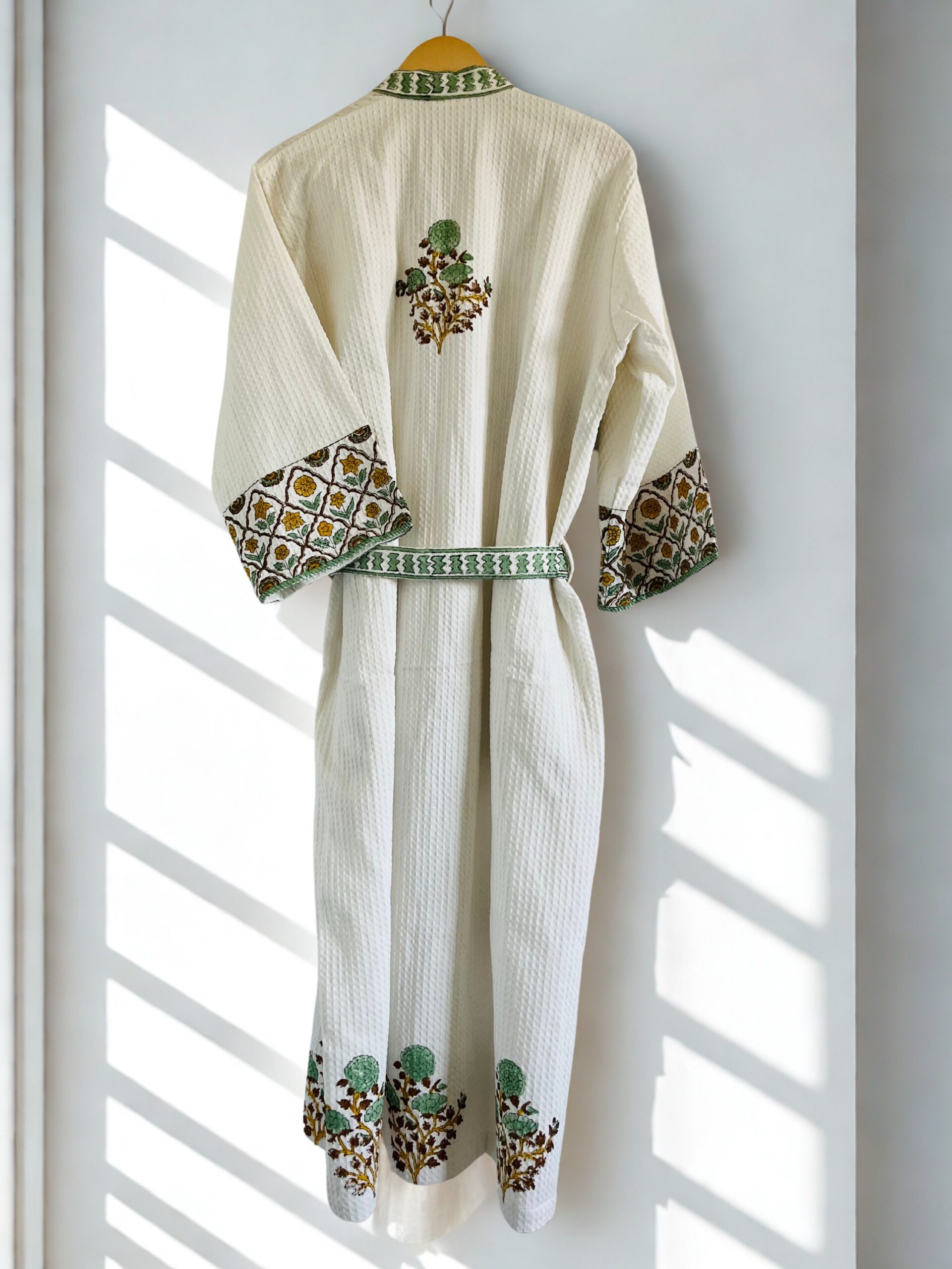 Handblock printed waffled cotton robe (Green Motifs)