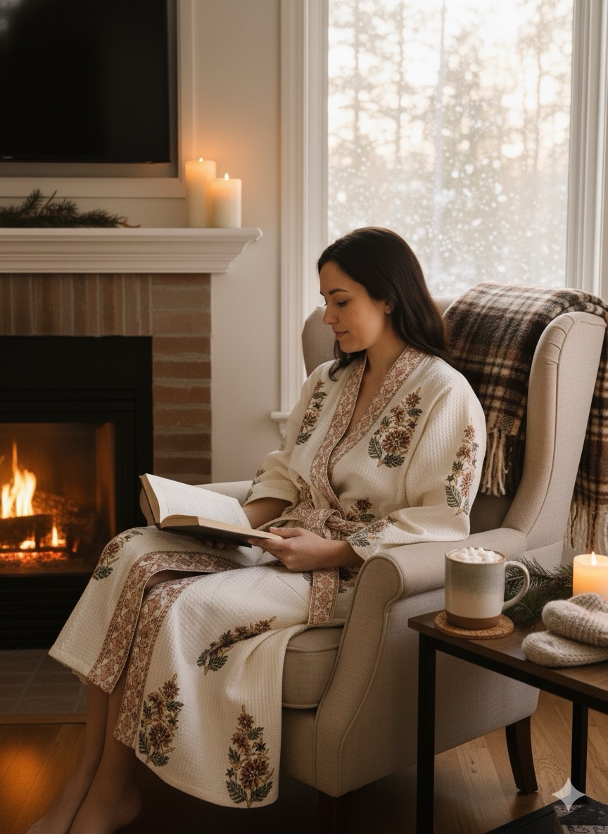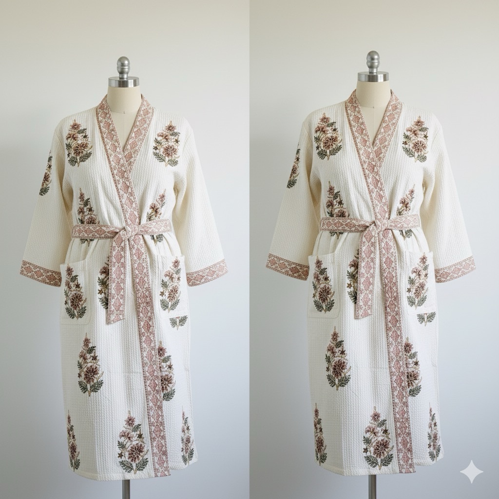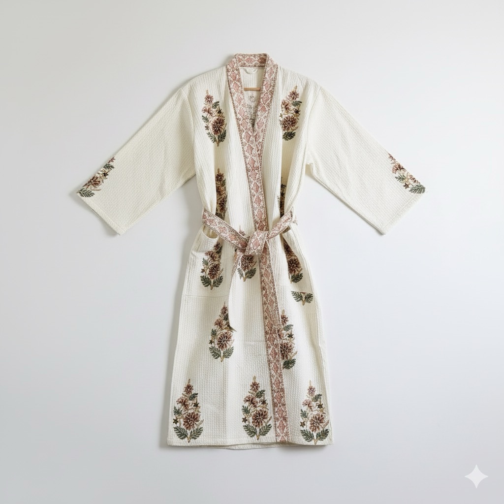 Indulge in both comfort and elegance with this exquisite 100% cotton waffle weave. Its beautiful block print design is elevated by sophisticated printed border accents along the neckline, front opening, and sleeve cuffs. Designed for both practicality and style, it features a front overlap closure, two convenient front pockets, and a matching belt secured by side loops for the perfect fit. One size fit from Xs-L.