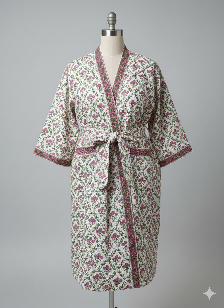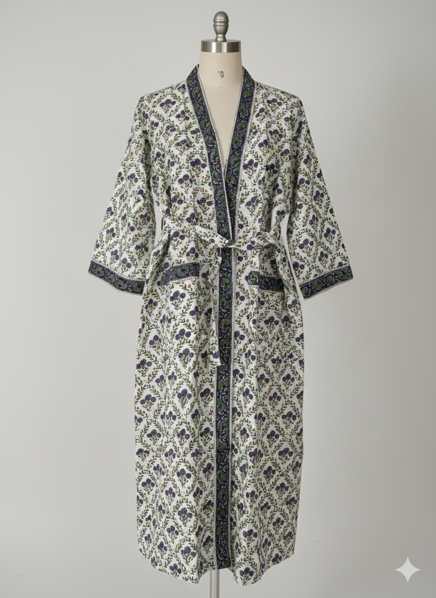 Indulge in both comfort and elegance with this exquisite 100% cotton waffle weave. Its beautiful block print design is elevated by sophisticated printed border accents along the neckline, front opening, and sleeve cuffs. Designed for both practicality and style, it features a front overlap closure, two convenient front pockets, and a matching belt secured by side loops for the perfect fit. Available in 3 sizes.