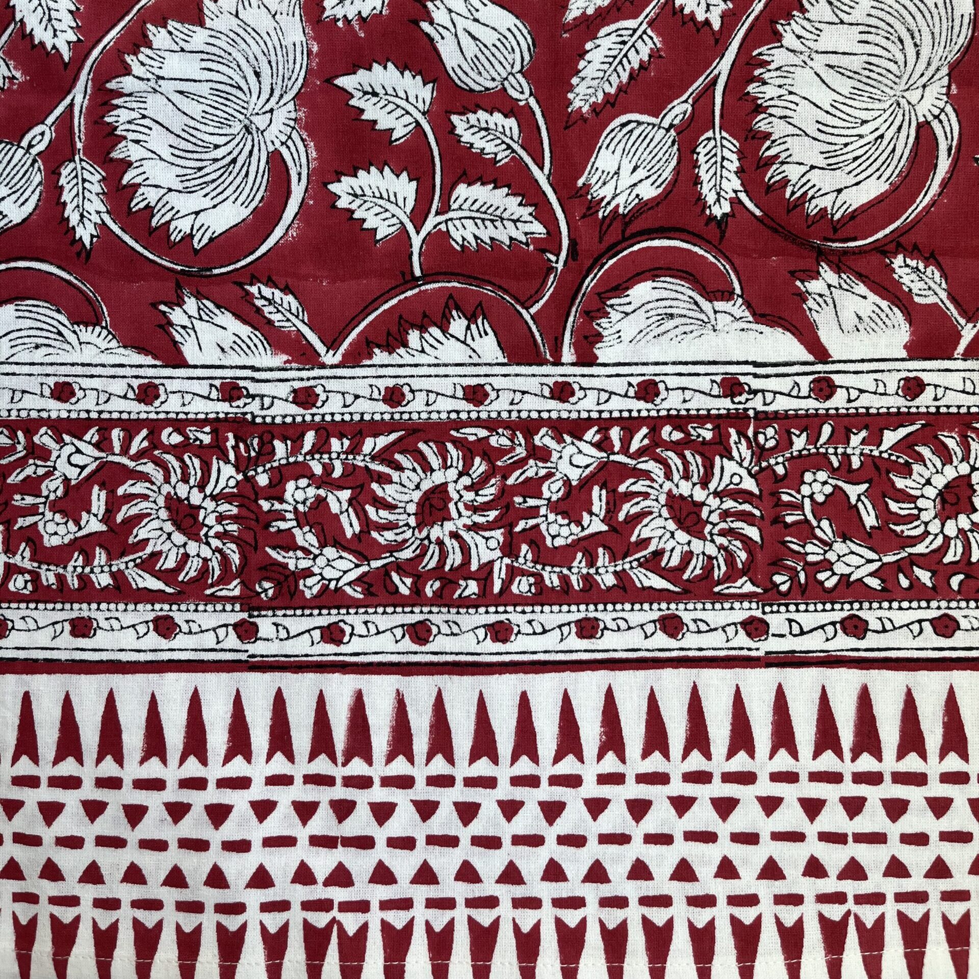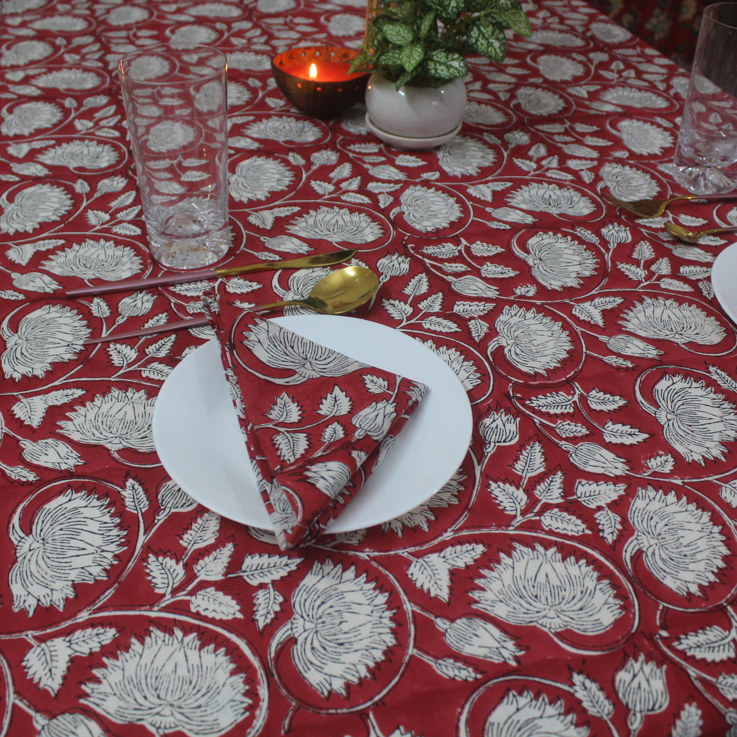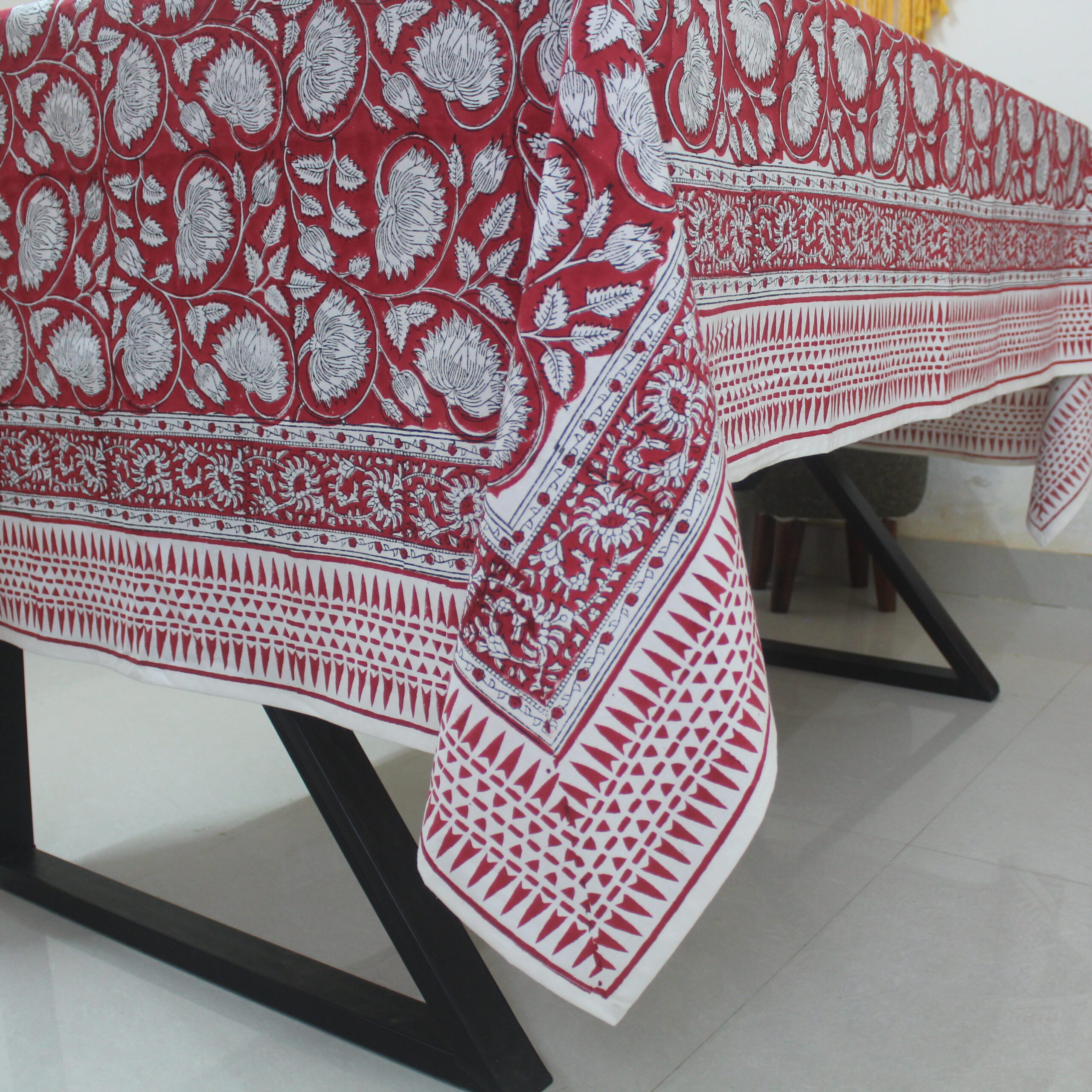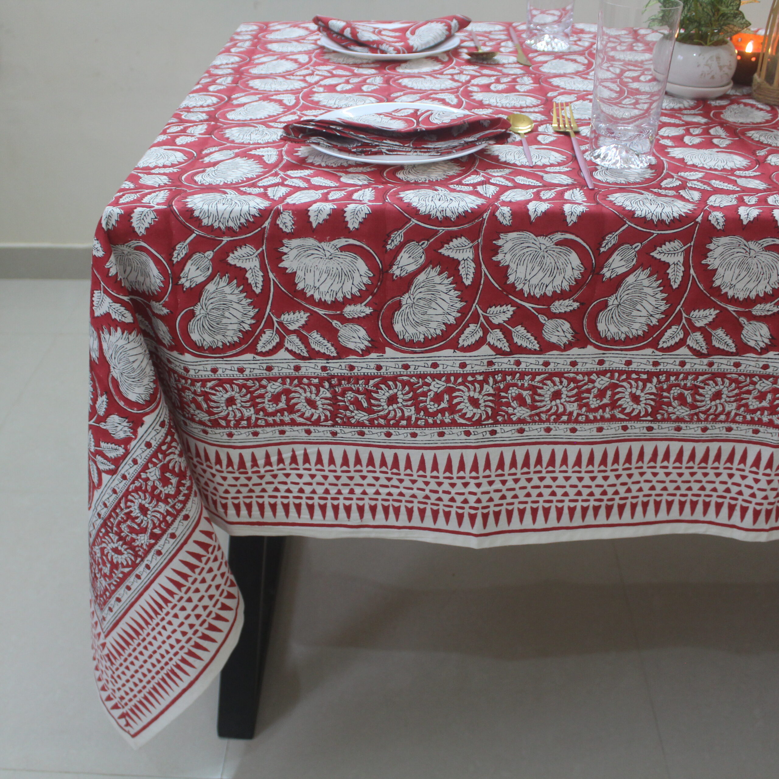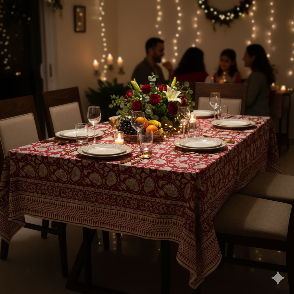 Handcrafted 100% cotton table cover, hand block printed by artisans for a timeless, elegant look — perfect for both everyday and festive dining.