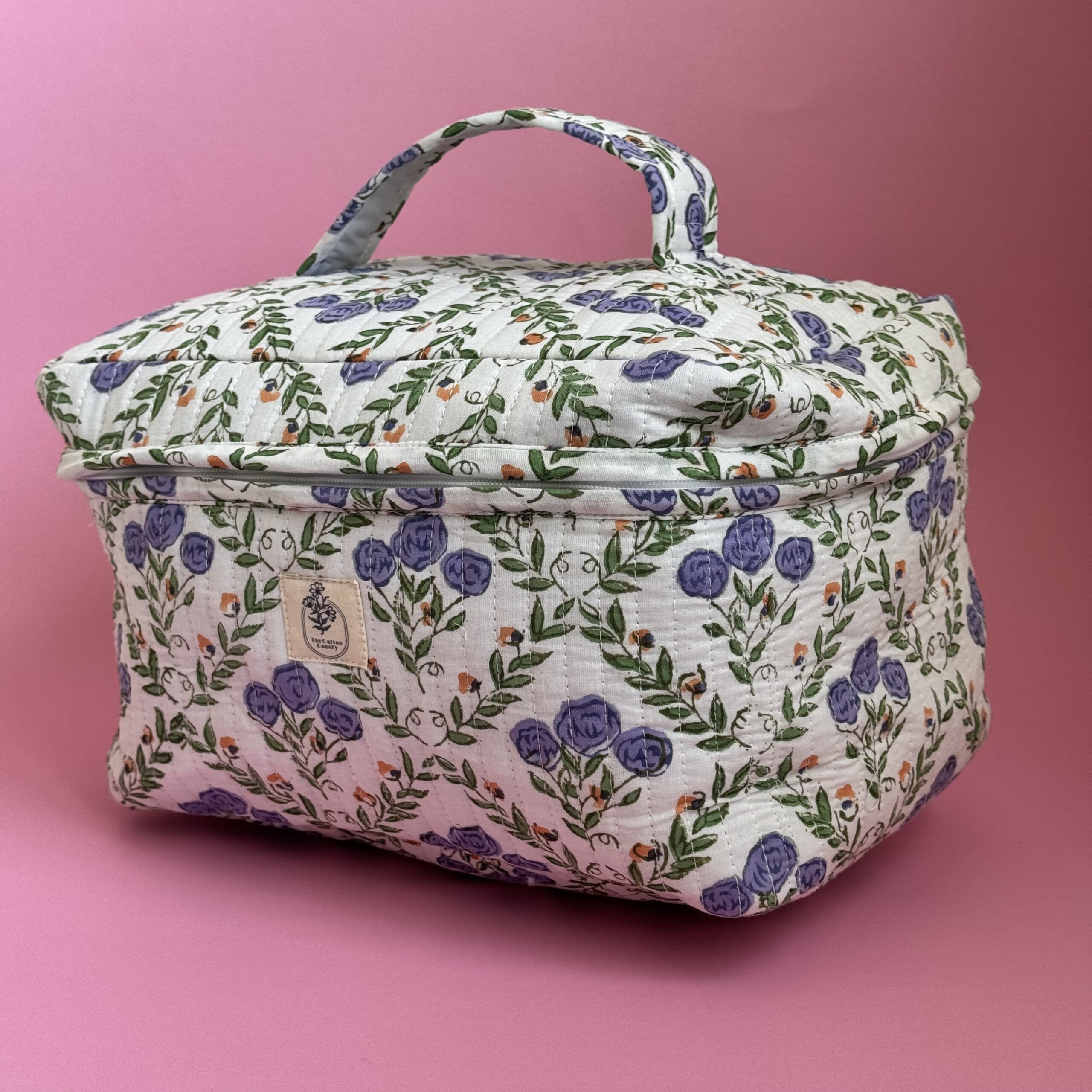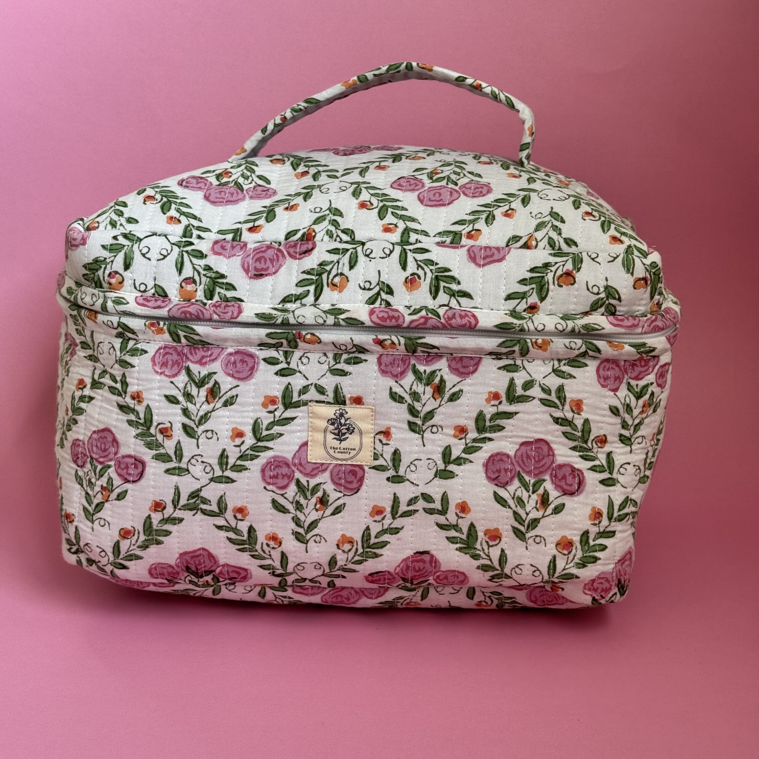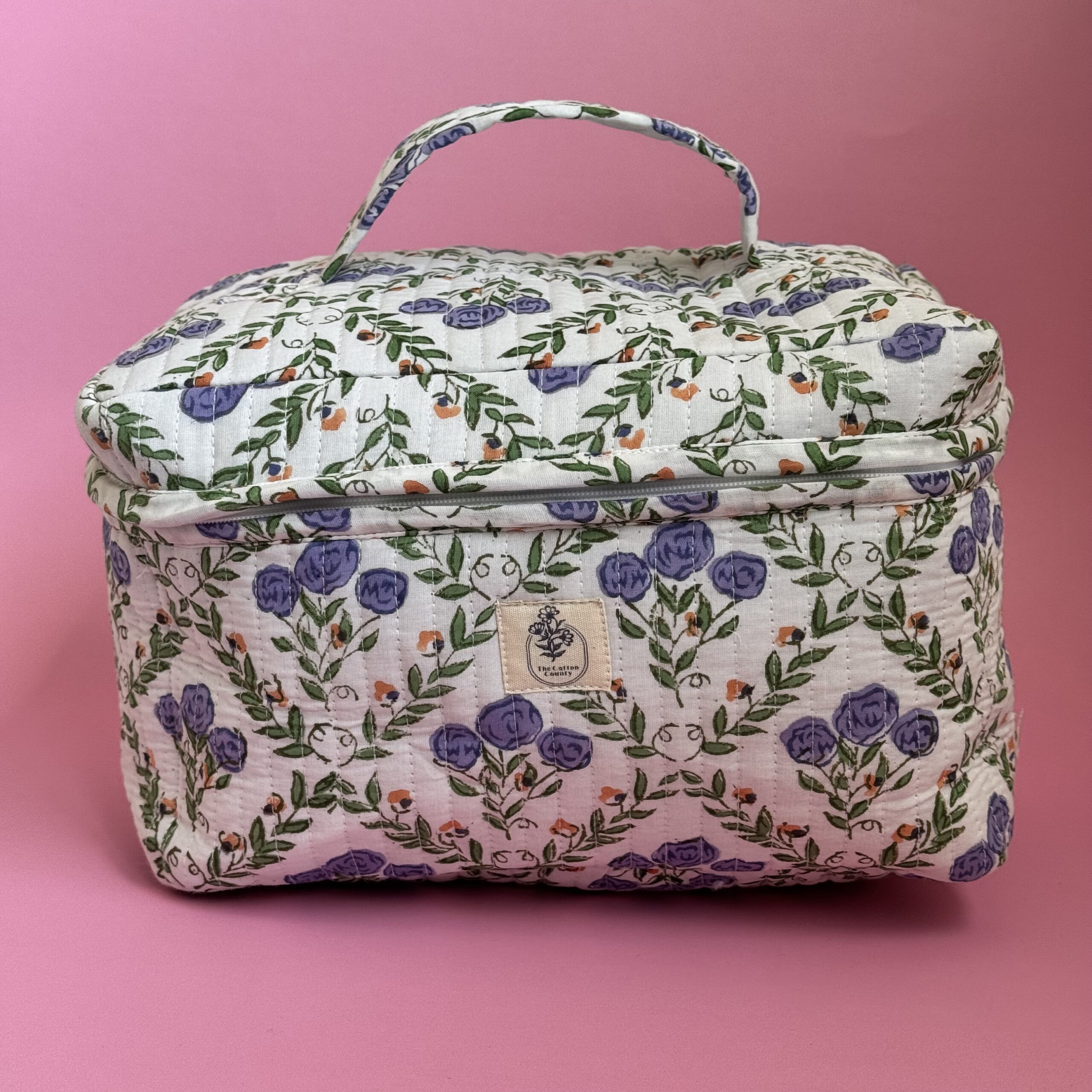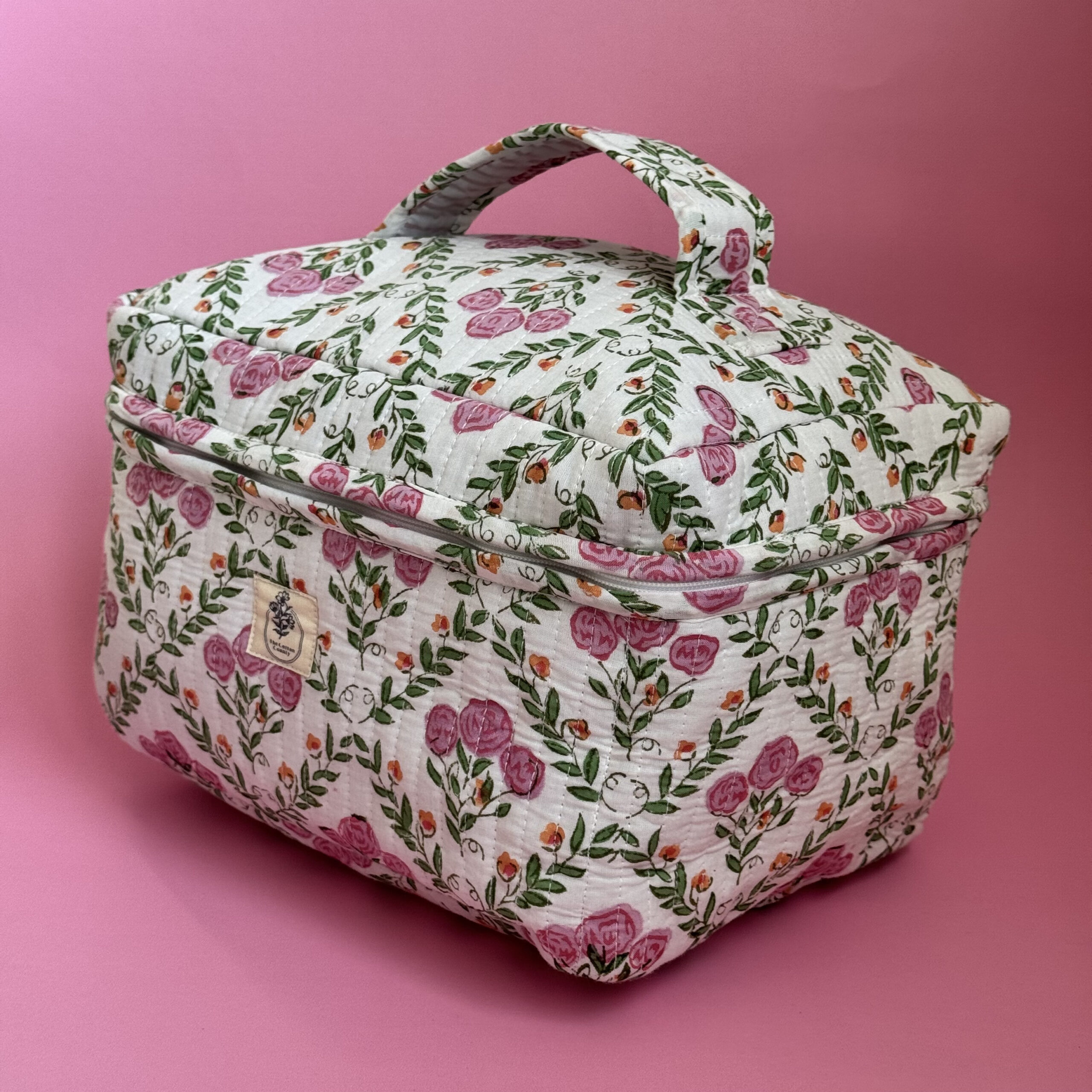 Stay effortlessly organized with this spacious and stylish floral makeup/ vanity bag. Crafted from 100% cotton and adorned with traditional floral hand block prints, this large-capacity vanity bag is perfect for storing makeup brushes, skincare products, perfumes, toiletries, and more.
